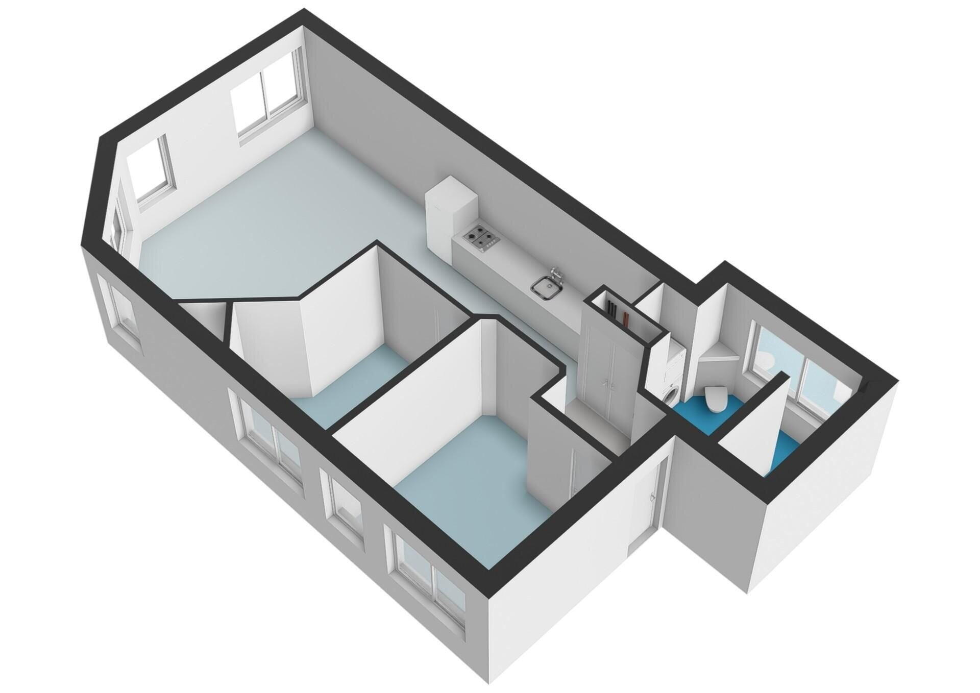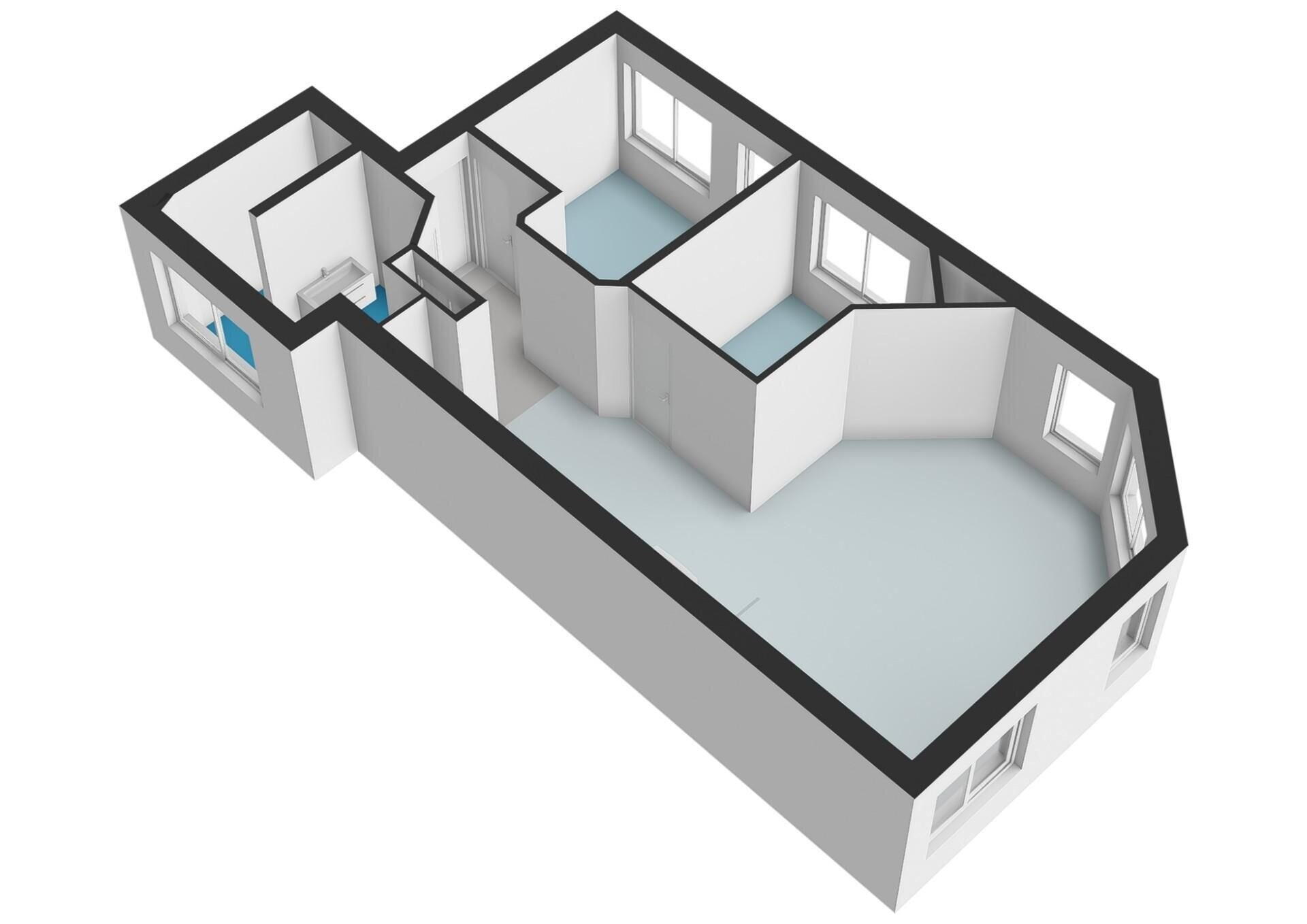 De hal biedt toegang tot alle vertrekken. De badkamer beschikt over een raam voor natuurlijk licht, een toilet, een ruime inloopdouche en een brede wastafel. Daarnaast is er een aparte kast met aansluitingen voor wasmachine en droger.